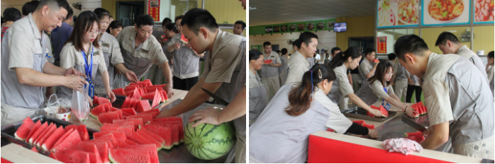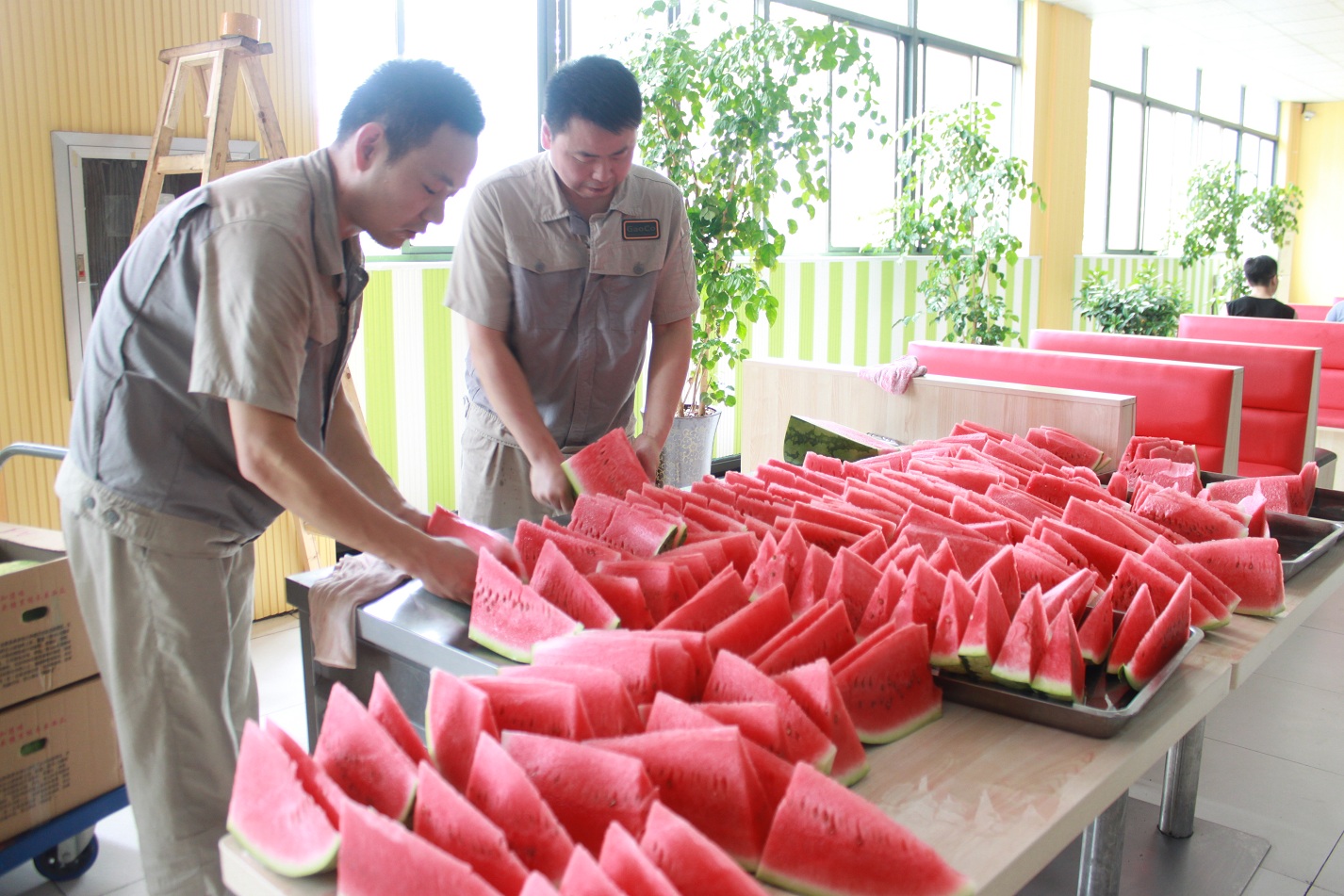開餐時間到了,員工陸續(xù)來到餐廳,帶著一身暑氣,拿起西瓜咬了一口,從他們豆大汗珠的臉上,能感受到那份幸福與清涼。